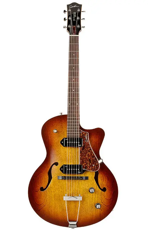 Der Korpus aus kanadischem Kirschenholz (Boden, Zargen und Decke) in Kombination mit einer Archtop-Konstruktion mit gewölbter Decke und Boden fördert eine breite Projektion, besonders in den Bässen und Mitten, mit einem holzigen und reaktiven Charakter. Am Verstärker liefert das Paar Godin Kingpin P90 Tonabnehmer eine vintage-typische Präsenz: mehr Biss und Luft als ein Humbucker, mehr Körper als ein klassischer Single-Coil. Der 3-Wege-Schalter ermöglicht einen schnellen Wechsel vom warmen, runden Hals-Tonabnehmer zum schärferen Steg-Tonabnehmer, mit einem sehr musikalischen Gleichgewicht in der Mittelposition, alles gesteuert über Volume und Ton zur Klangformung.